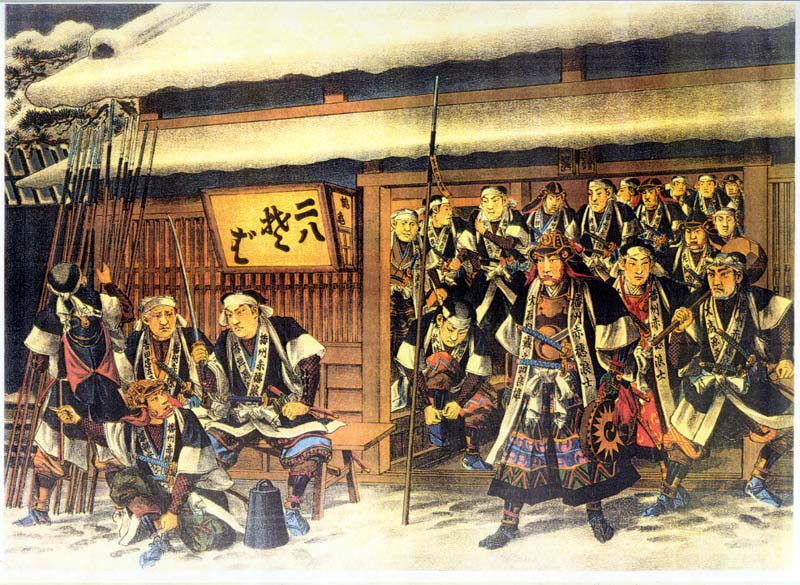En 1701, l’ empereur Higashiyama avait envoyé de Kyôto des ambassadeurs afin de présenter ses voeux au shôgun Tokugawa Tsunayoshi, à Edo. Le shôgun chargea deux daimyô de s’occuper des cérémonies afin de recevoir les envoyés impériaux. L’un d’eux, Asano Naganori, du petit domaine d’Akô, à l’ouest de Honshû, manquait d’expérience et demanda alors conseil au grand maître de cérémonie, Kira Yoshinaka, qui lui refusa son aide. Asano réitéra plusieurs fois sa demande, mais il fut à chaque fois repoussé et insulté par Kira.