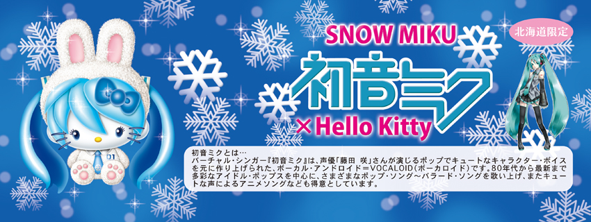 L’idole Vocaloïdienne, Miku Hatsune vient d’être annoncer partenaire de Hello Kitty (Sanryo©) pour une ligne de produit qui sera uniquement disponible dans le Nord du Japon, sur l’île de Hokkaido.